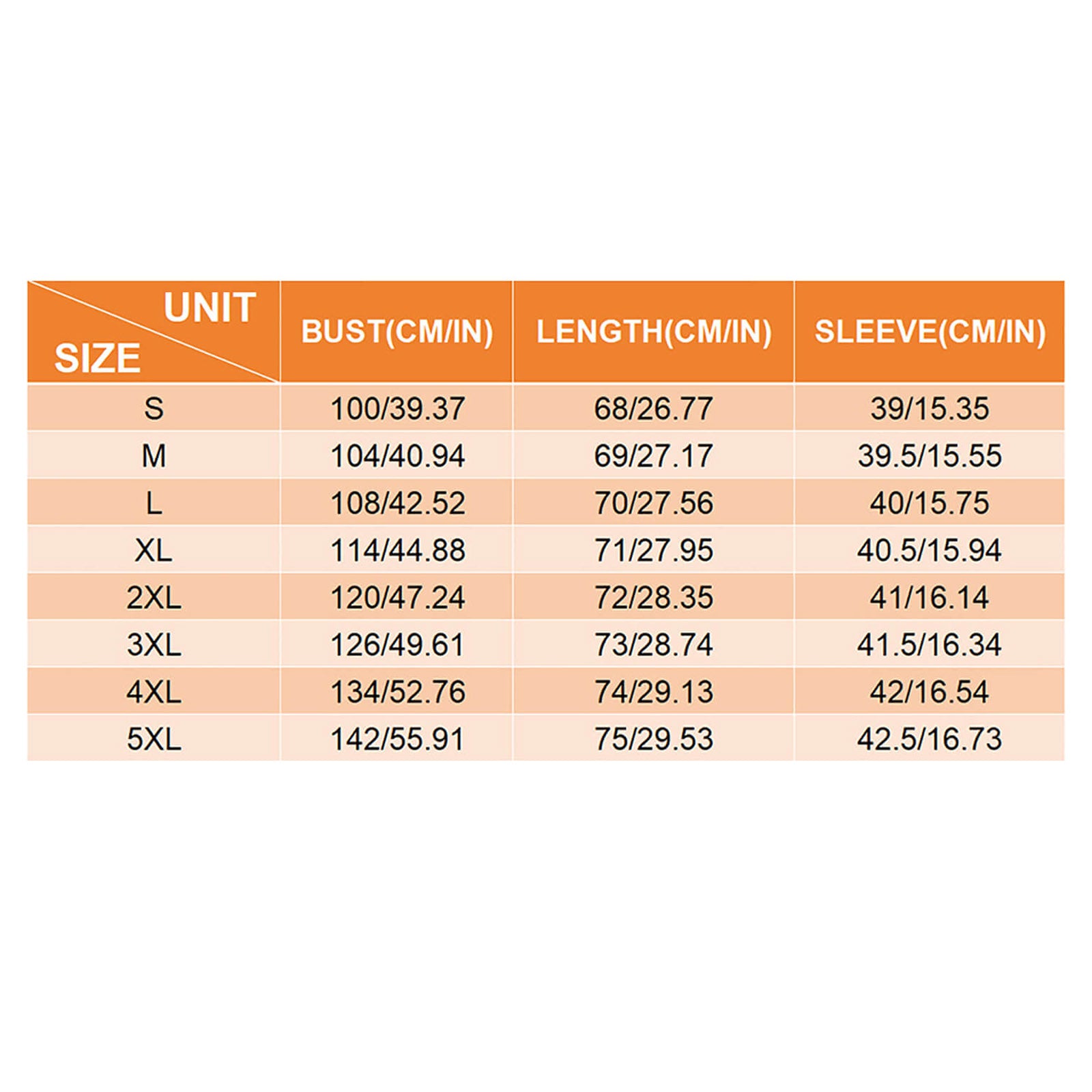 • Tailles : S, M, L, XL, 2XL, 3XL, 4XL, 5XL. Veuillez consulter le tableau des tailles ci-dessous pour choisir la vôtre.
