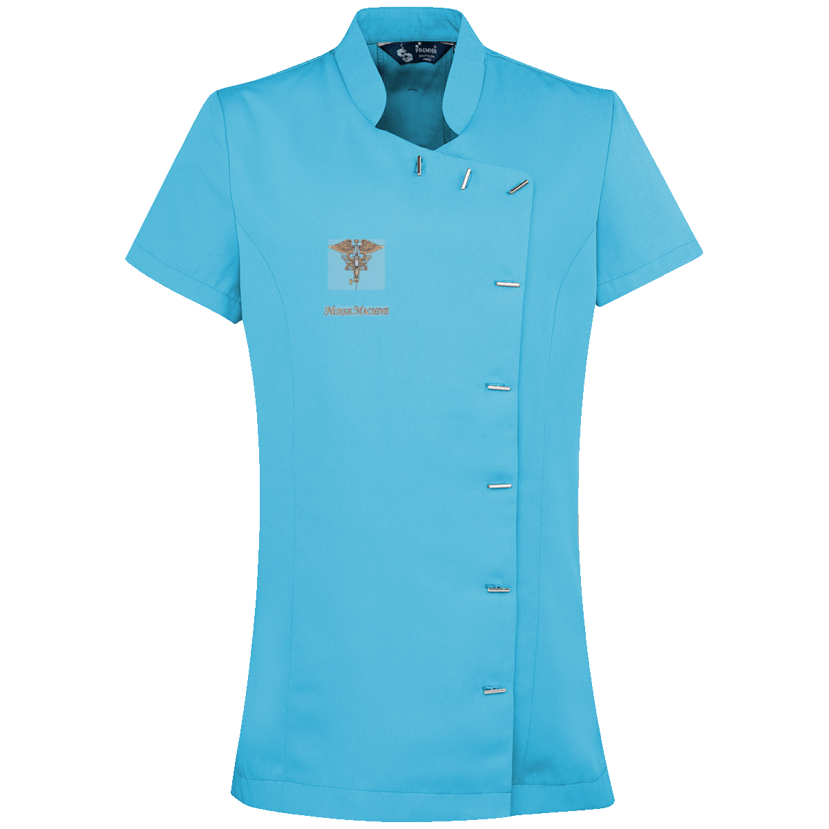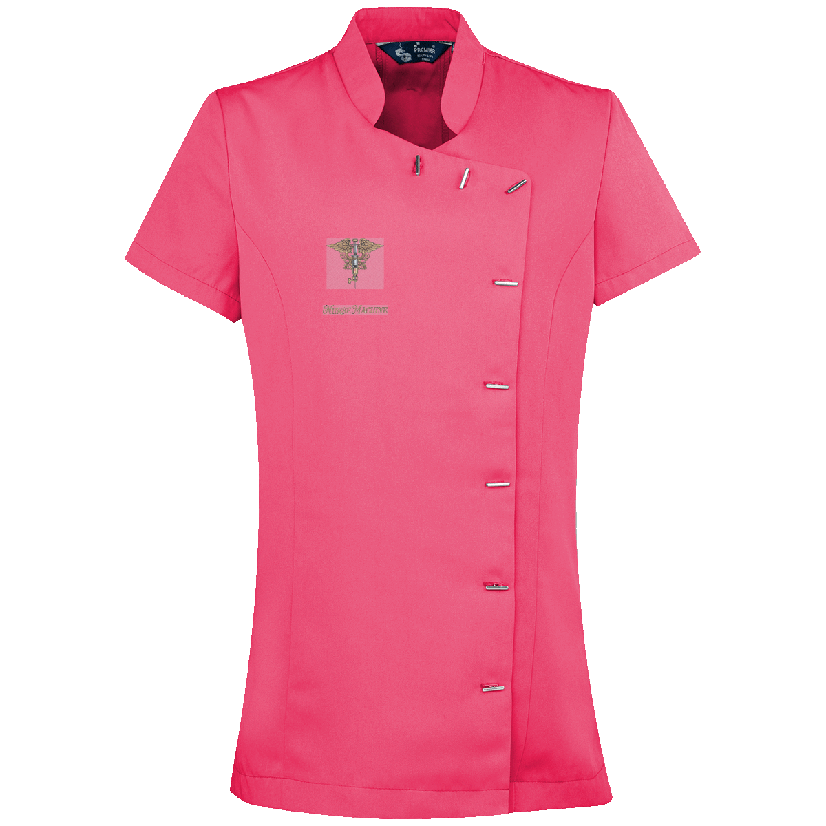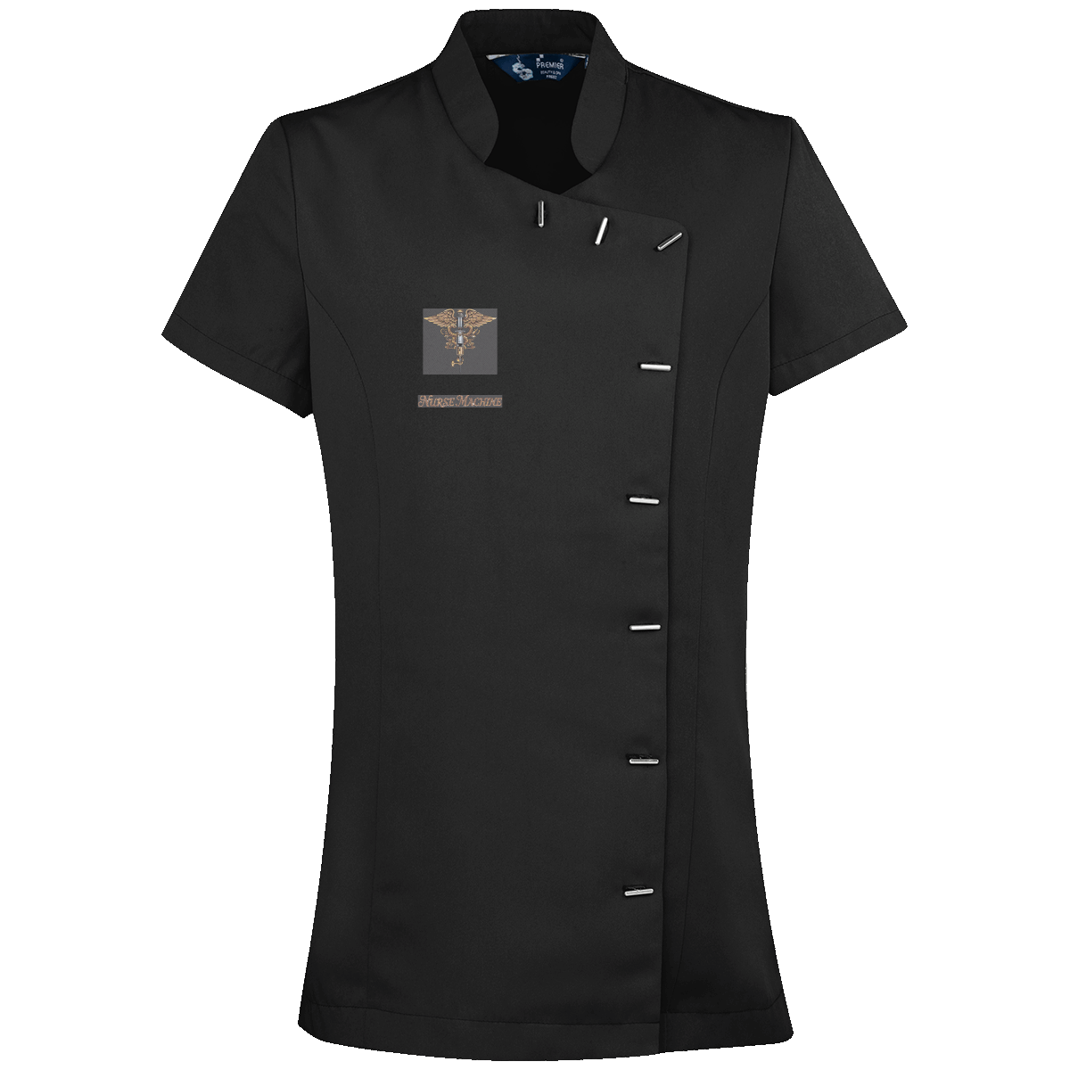 Coupe féminine: silhouette mise en valeur.\\nManches courtes: aisance de mouvements.\\nTissu résistant facile d\\\'entretien.\\nToile 100% polyester avec effet stretch. Tunique pour esthétique ou spa avec col mao. Manches courtes. Système de boutonnage asymétrique sur le devant avec boutons forme barrette. Fentes latérales. Pli dans le dos pour une meilleure aisance. Coutures princesse. Facile d\\\'entretien.